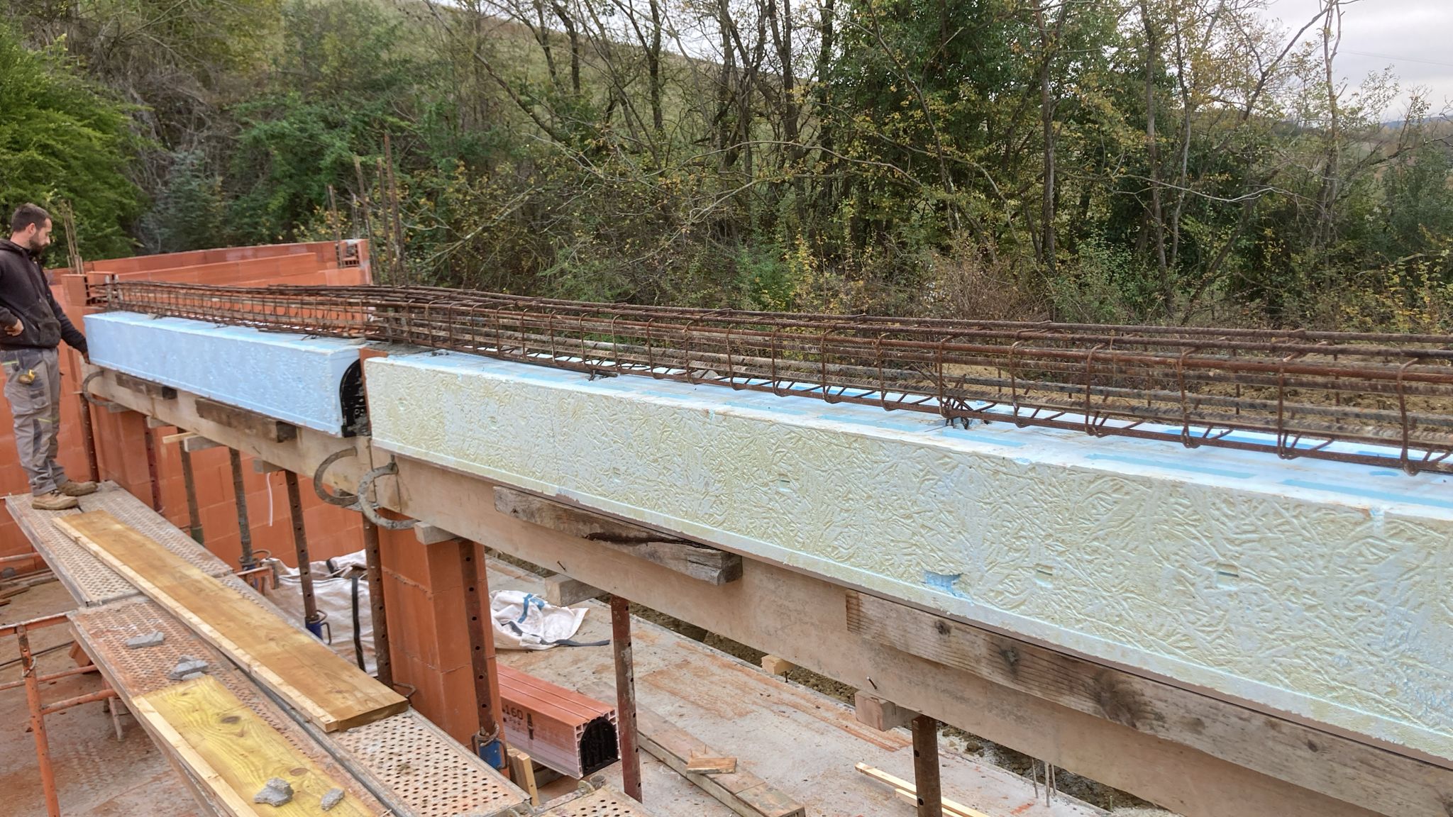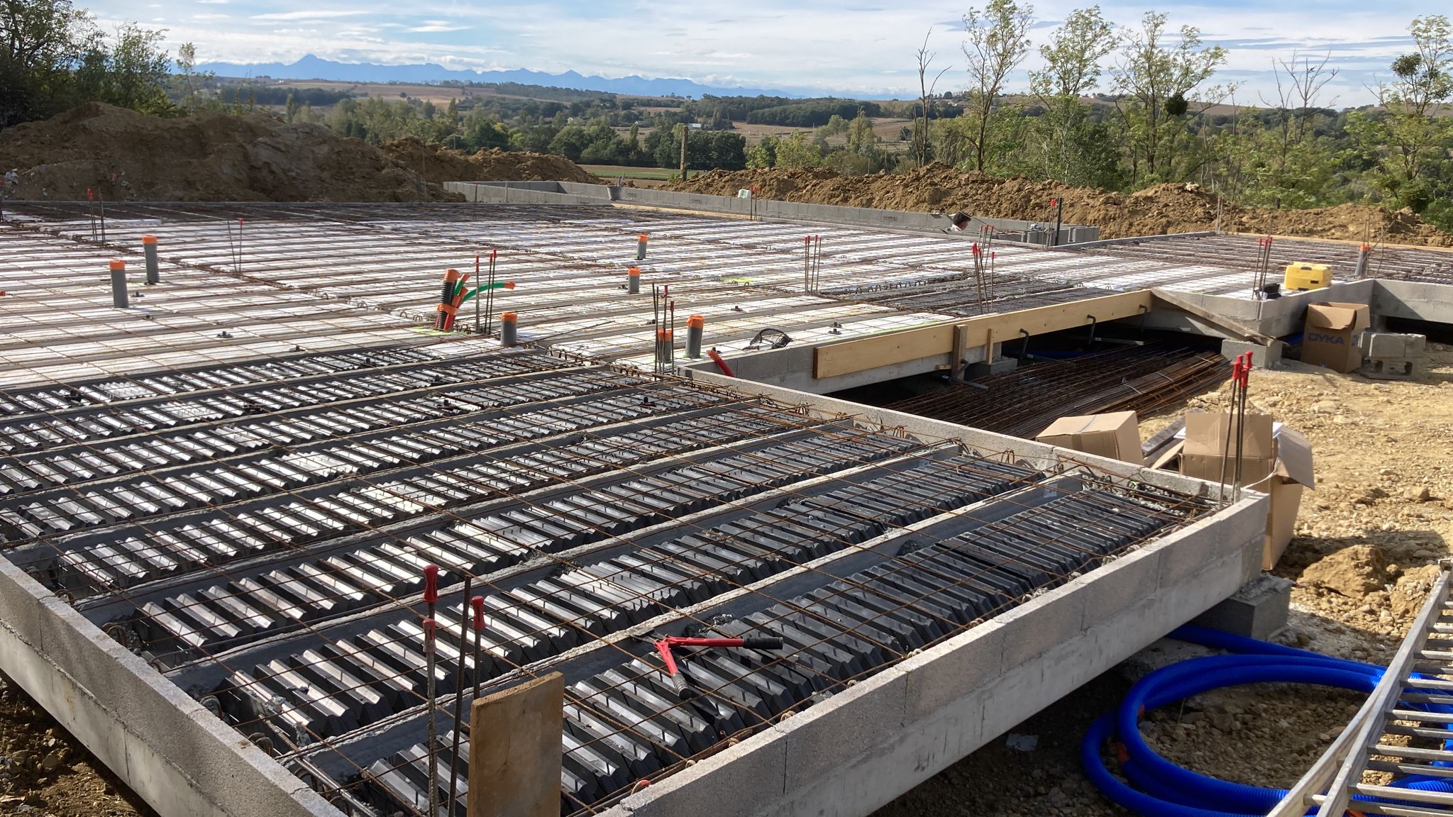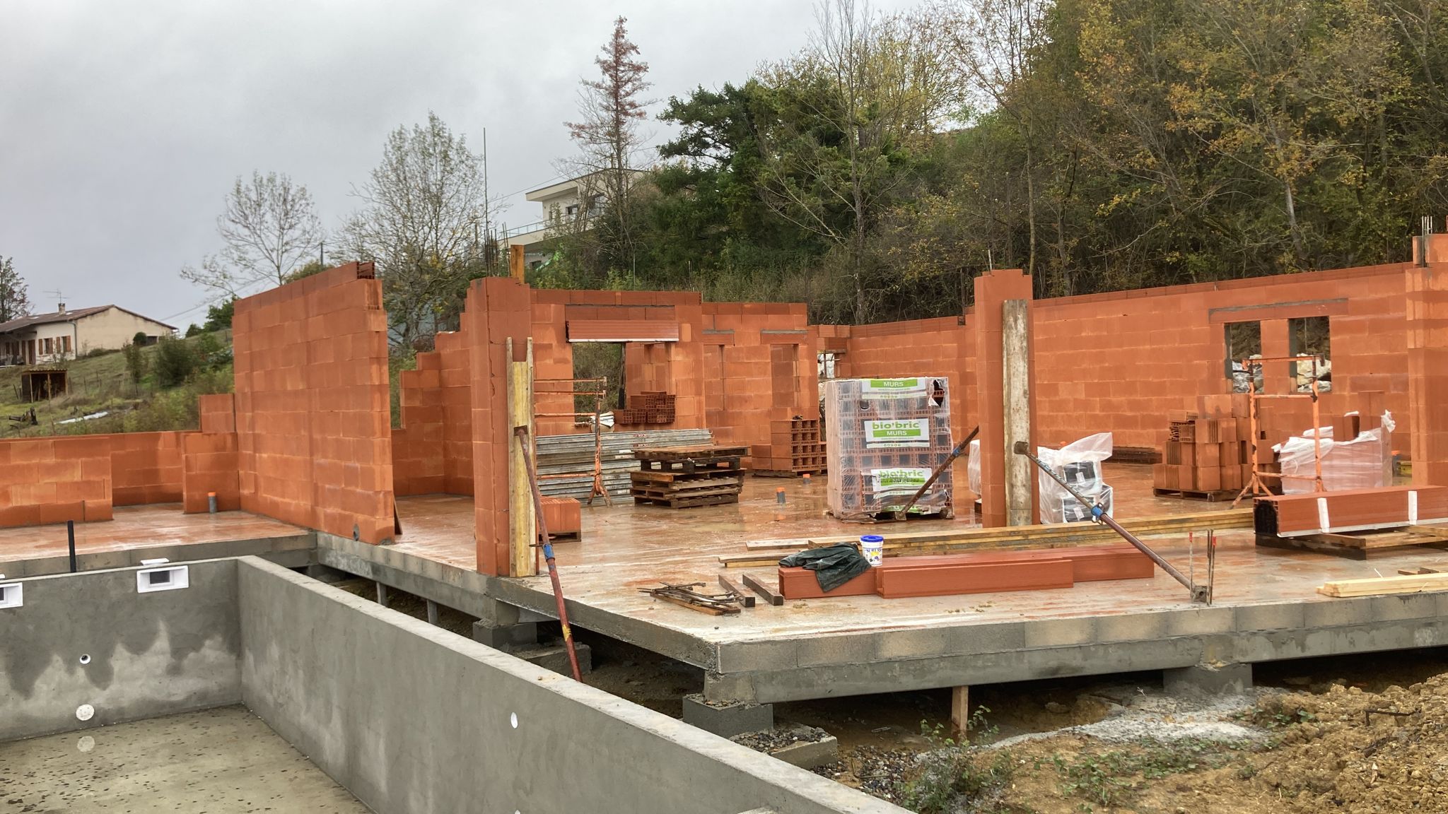 Nous avons réalisé ce chantier de maison individuelle en prenant en charge l’ensemble du gros œuvre, depuis les fondations jusqu’à l’élévation des murs en briques. Le projet a débuté par la mise en place du plancher avec pose des poutrelles-hourdis, du treillis soudé et préparation avant coulage du béton.